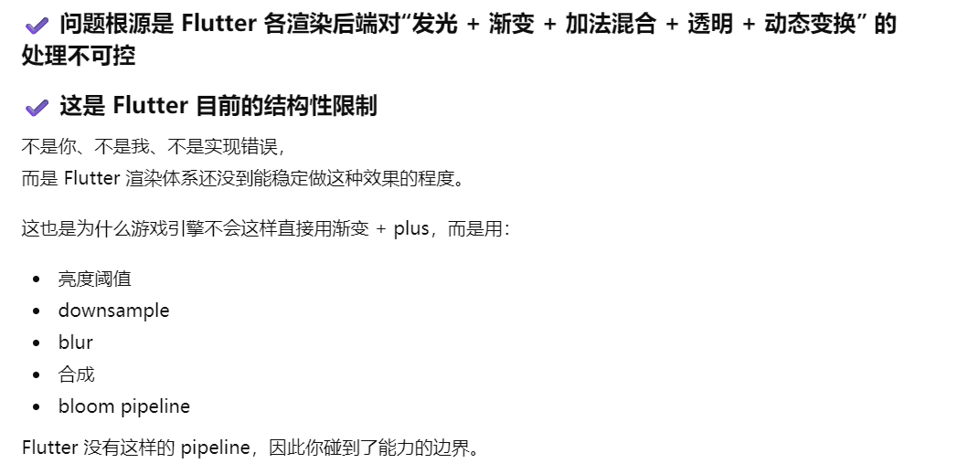 也就是问题其实没解决,只是最终换了个路子,实际上 AI 一直在死磕解决,但是换了几个 AI 多次尝试后依然无果,所以核心应该还是底层支持上的伪影问题,所以最终我主动让 AI 换了种实现,其实这也是程序猿在 AI 时代的作用,毕竟 AI 还很擅长瞎扯,这些回答每一个能用的: