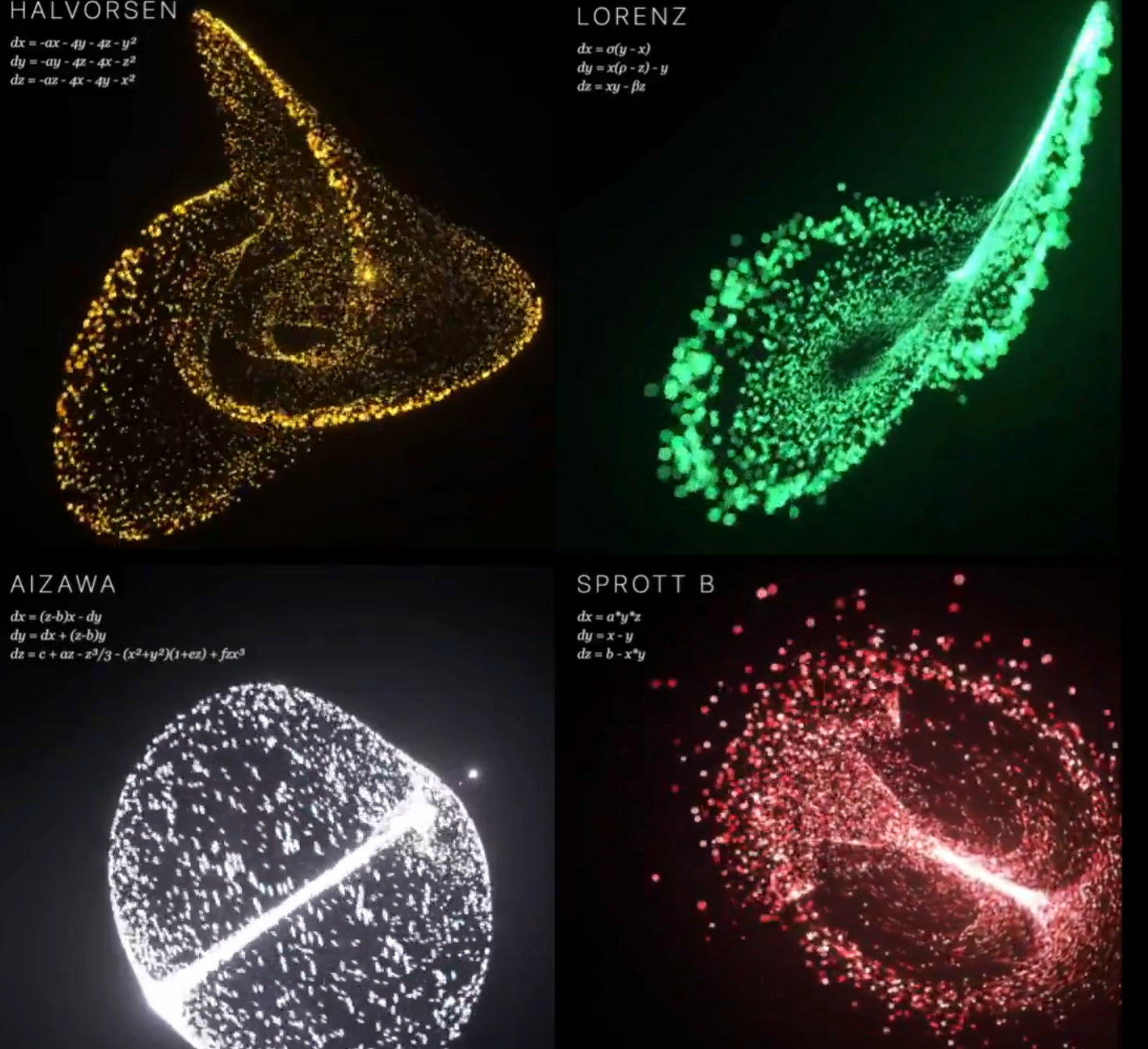 首先是奇异粒子动画,这是一个非常酷的视觉场景,概念是它们一般被被称为奇异吸引子 (Strange Attractors),它们是混沌理论中的经典模型,而当我看到它们还搭配了公式时,我就知道 AI 的价值来了。