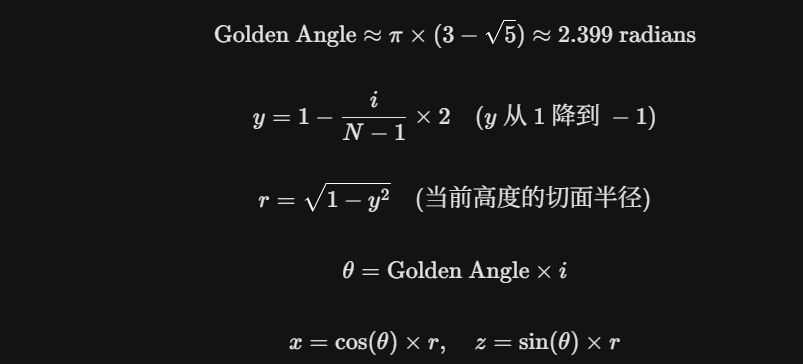 所以 AI 首先需要的是实现一个球体算法,核心思想是将原本在 2D 平面上画向日葵种子的“黄金螺旋”算法,投影到了 3D 球面上,具体是利用黄金角 (Golden Angle) 来决定每个点的角度偏移: