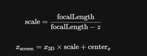 然后就是透视投影 (Perspective Projection),这是让 2D 屏幕产生 3D 纵深感的关键,物体离相机越远(Z 越小/负值),在屏幕上看起来就越小,位置越靠近中心: