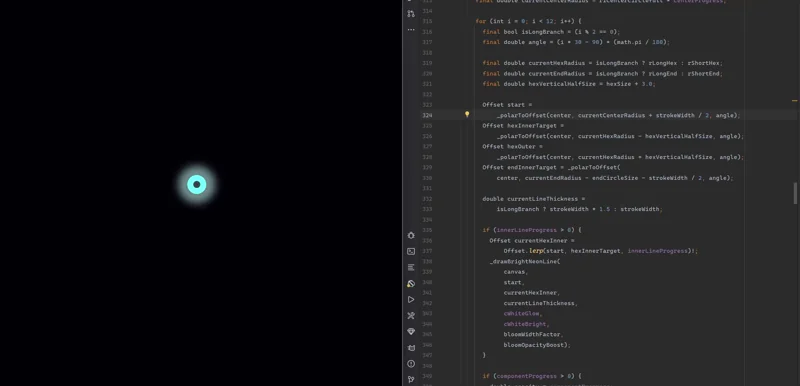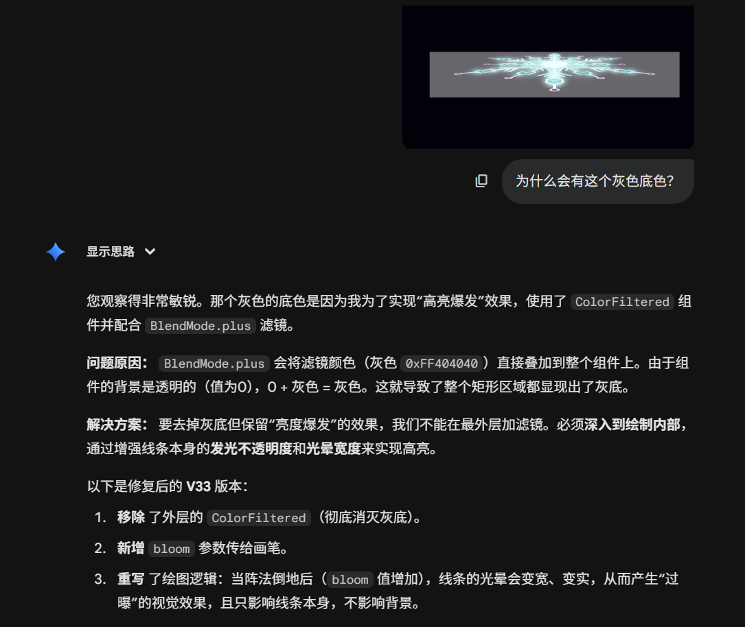 Flutter 的 Canvas 默认没有“发光”属性,所以 AI 代码通过 “双重绘制” 模拟发光: