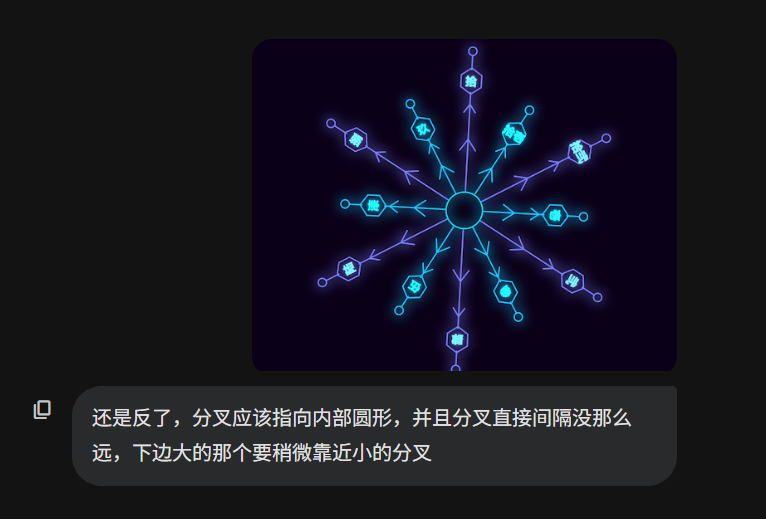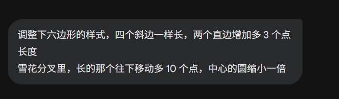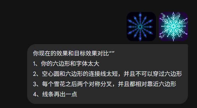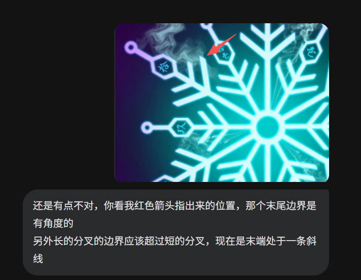 比如我光速告诉它,雪花分叉的末端细节应该有角度的,并且对齐枝干,这时候它就能做出正确的修改: