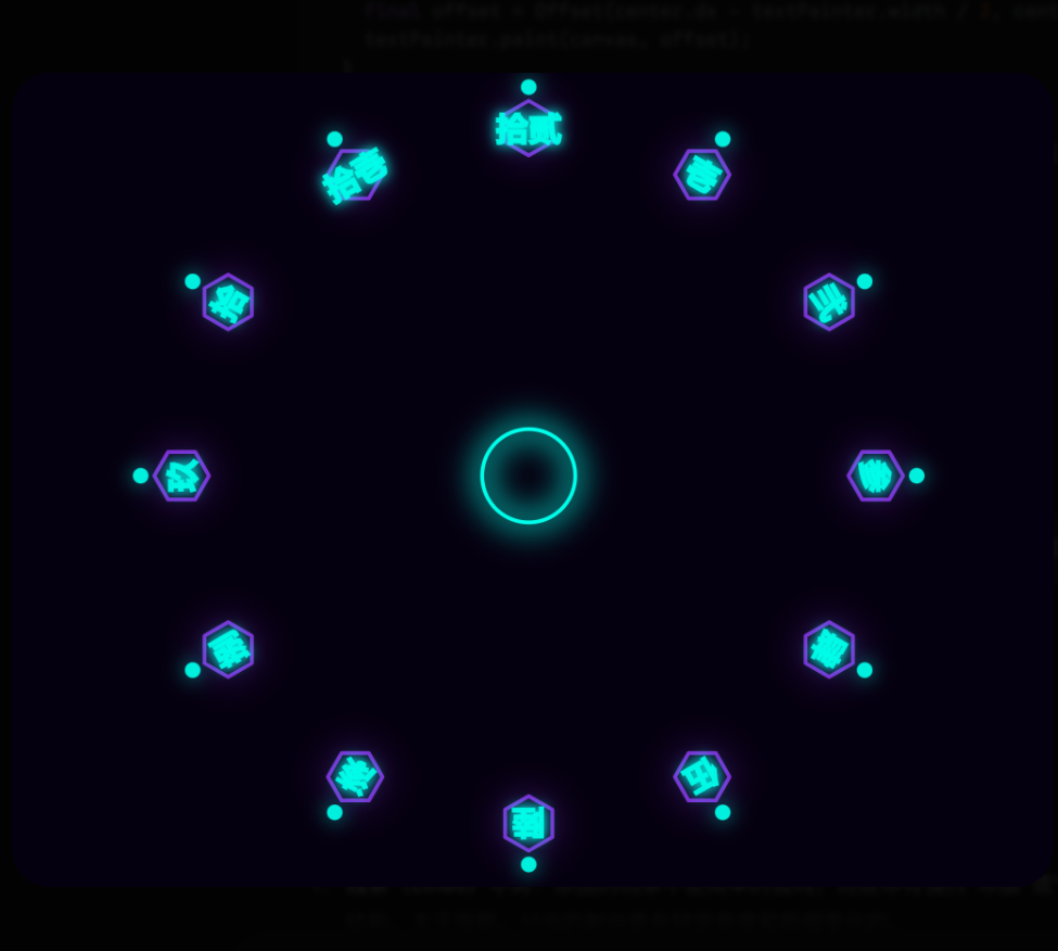 另外,文字也需要角度,当你画位于“3点钟”方向的文字“参”时,文字应该是正的,但当你画“6点钟”方向的文字时,如果直接画,文字可能会歪,所以代码在绘制六边形和文字时,用到了 canvas.rotate,这也是基于极坐标思想的延伸:
