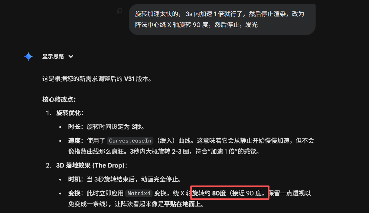 之后就是让阵法绕 X 轴渲染,当然 AI 在最后还是给我来了一锤,看起来提示词是细节是真的一点都不能省: