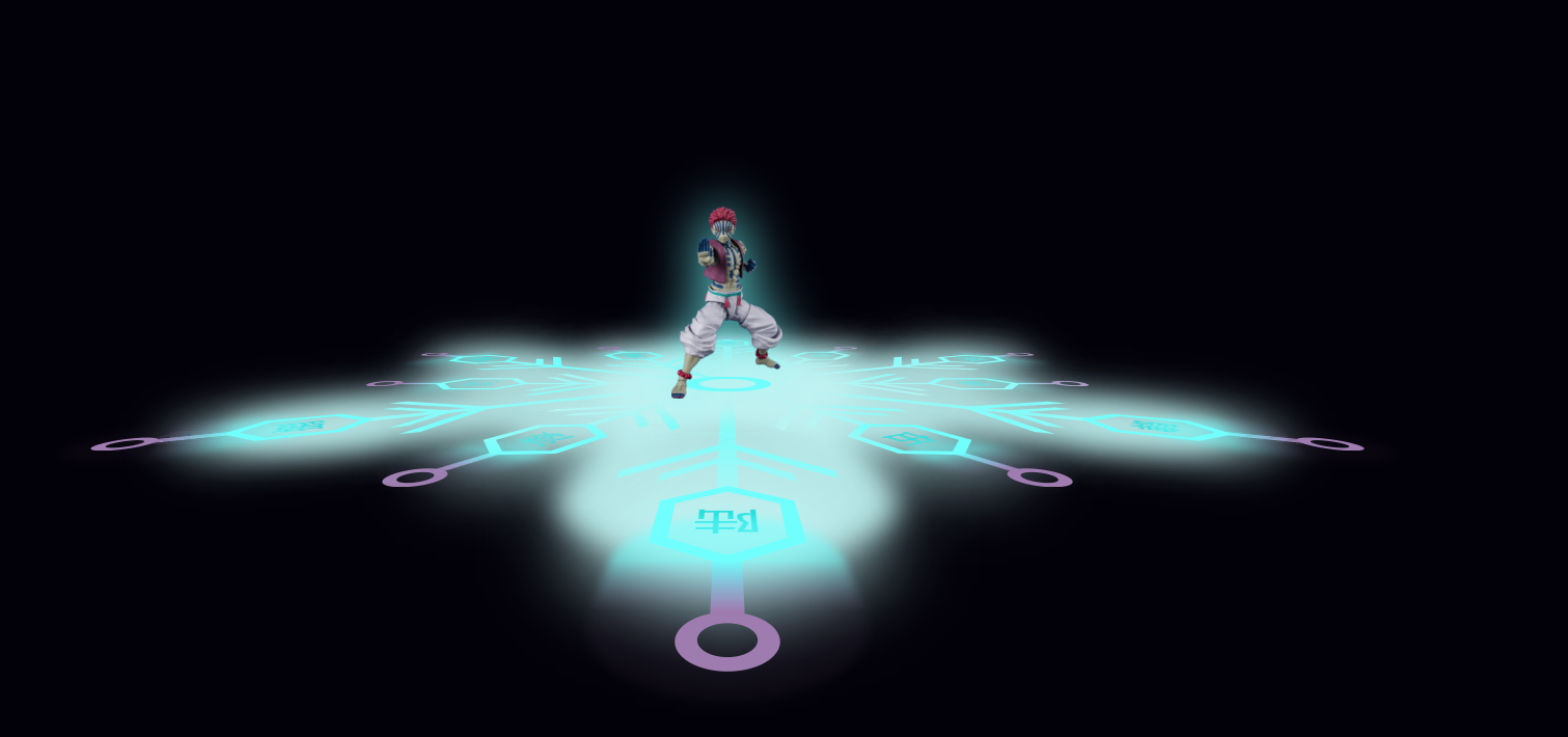 最后一步是将人物 akaza.png 放置在阵法中心,由于人物图片可能是全身像,中心点在腰部,但阵法中心应该对齐“脚底”,所以代码使用了 Matrix4.translationValues 进行了微调: