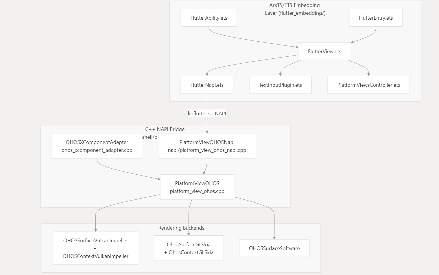 engine/src/flutter/shell/platform/ohos/:C++ 原生层实现,包含平台适配、渲染后端、NAPI 桥接等engine/src/flutter/shell/platform/ohos/flutter_embedding/:ArkTS 嵌入层实现,提供 Flutter 应用在鸿蒙上的运行时环境