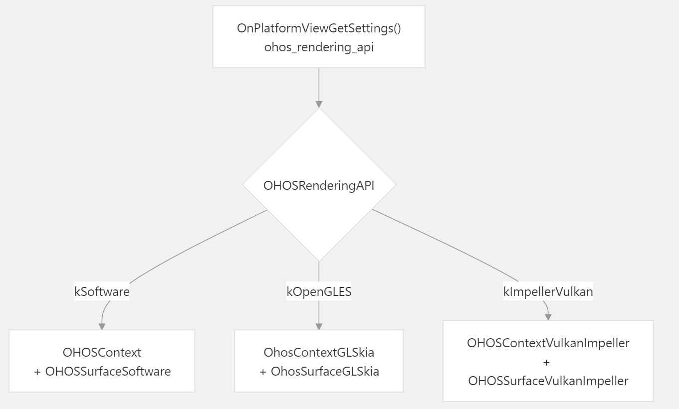 然后每个 Flutter 实例对应一个 OHOSShellHolder,持有完整的 Flutter Shell:ohos_shell_holder,OHOS 通过自己的抽象层(OHOSContext/OHOSSurface)和 NAPI 桥接,不直接构造 FlutterRendererConfig,而是由 PlatformViewOHOS 的 CreateRenderingSurface() 返回对应的 Surface 和 CreateOHOSContext 返回渲染上下文