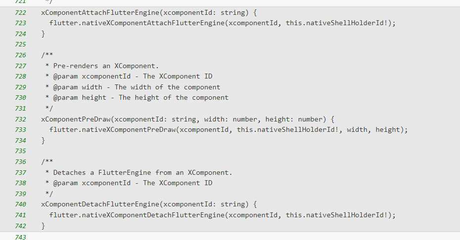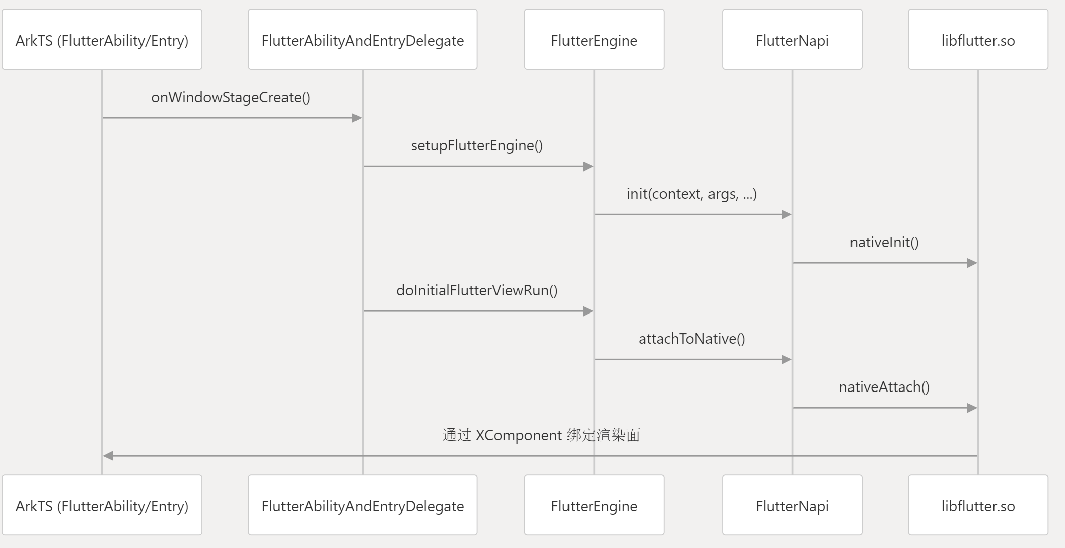FlutterNapi.init(),传入bundlePath (应用包路径)、appStoragePath(应用存储路径)、engineCachesPath(引擎缓存路径)、args(命令行参数)、initTimeMillis(初始化时间戳)、productModel` (设备型号) 等参数 FlutterNapi.xComponentAttachFlutterEngine()将XComponent和 native Shell 绑定,核心是将xcomponentId与nativeShellHolderId