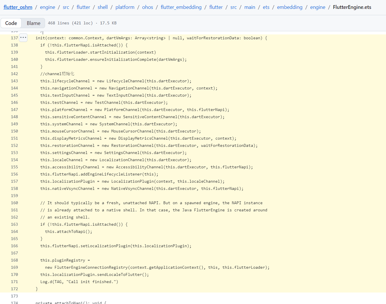 而这里 FlutterEngine 就是 Flutter 在 Embedding 的 ArkTS 执行环境的实现,管理所有系统通道和插件,主要包括: