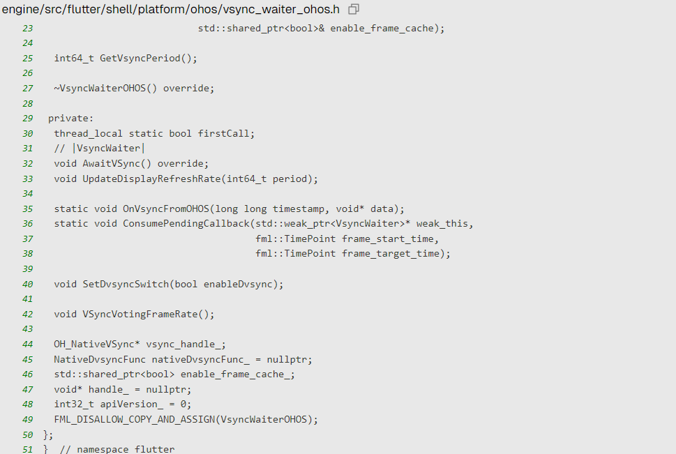 4、OH_NativeVSync 原生 VSync 信号驱动帧渲染,VsyncWaiterOHOS 负责等待信号并触发帧调度,同时支持帧缓存模式的 Dvsync 开关: