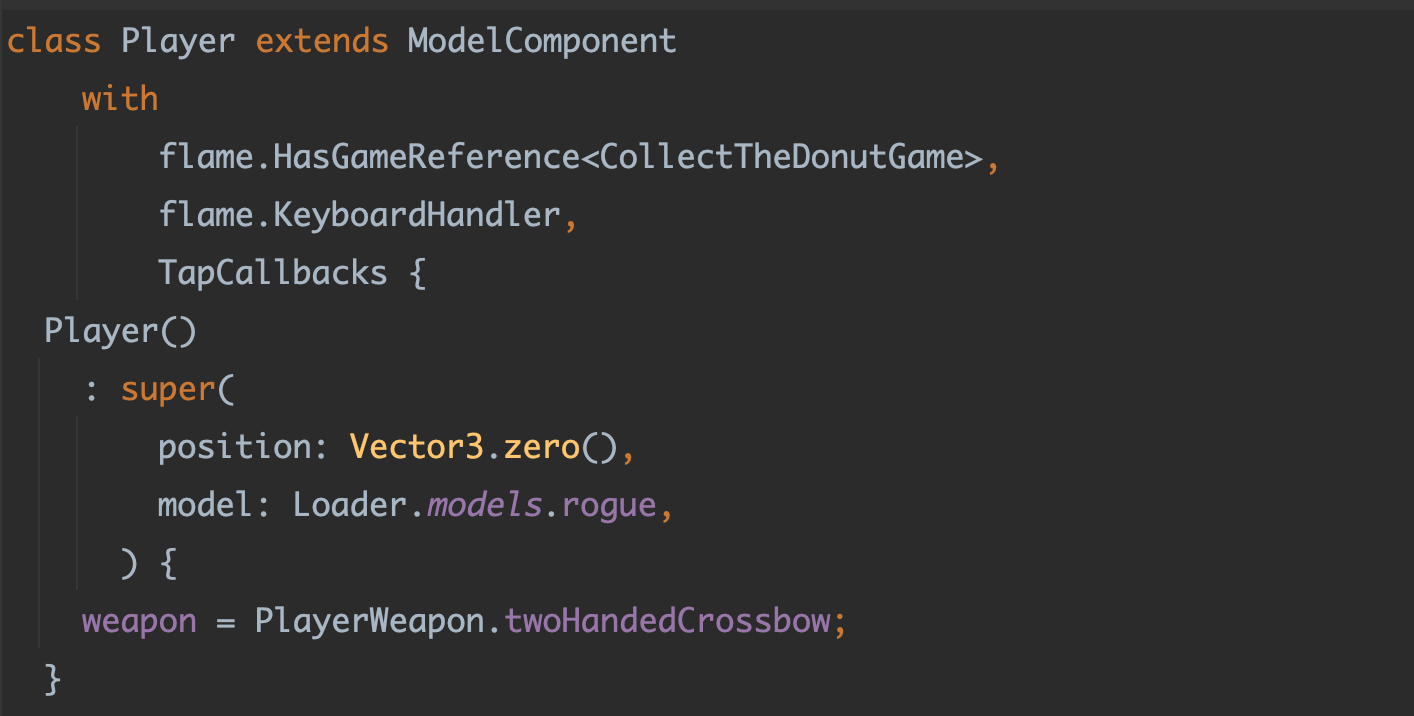而在实际使用上也并不复杂,比如对于我们操作的角色,在项目里对应的是 Player 封装,Player 类是一个继承自 ModelComponent 的自定义组件,并且通过混入 HasGameReference 获取对游戏实例的引用,并实现了 KeyboardHandler 和 TapCallbacks 接口,用于处理键盘输入和点击事件。