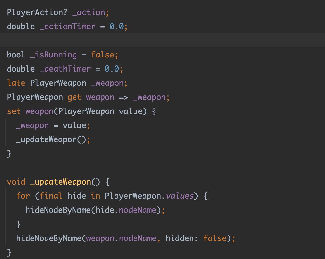 Player 类定义了一些关键属性,例如玩家的动作 _action、武器 _weapon、是否奔跑 _isRunning、死亡计时器 _deathTimer 等,而构造函数中默认将玩家的武器设置为 knife,并通过 _updateWeapon 方法隐藏其他武器节点,仅显示当前武器。