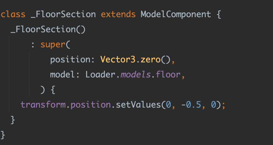 而 _FloorSection 继承自 ModelComponent,表示地板的单个网格单元,对应模型是通过 Loader.models.floor 加载,并设置了初始位置偏移量,使地板稍微低于默认高度:
