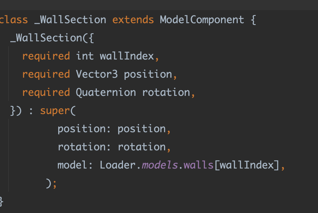同样道理,这里的 _WallSection 也继承自 ModelComponent,表示墙体的单个段,它的构造函数接收墙段的索引、位置和旋转,并从 Loader.models.walls 中加载对应的墙体模型: