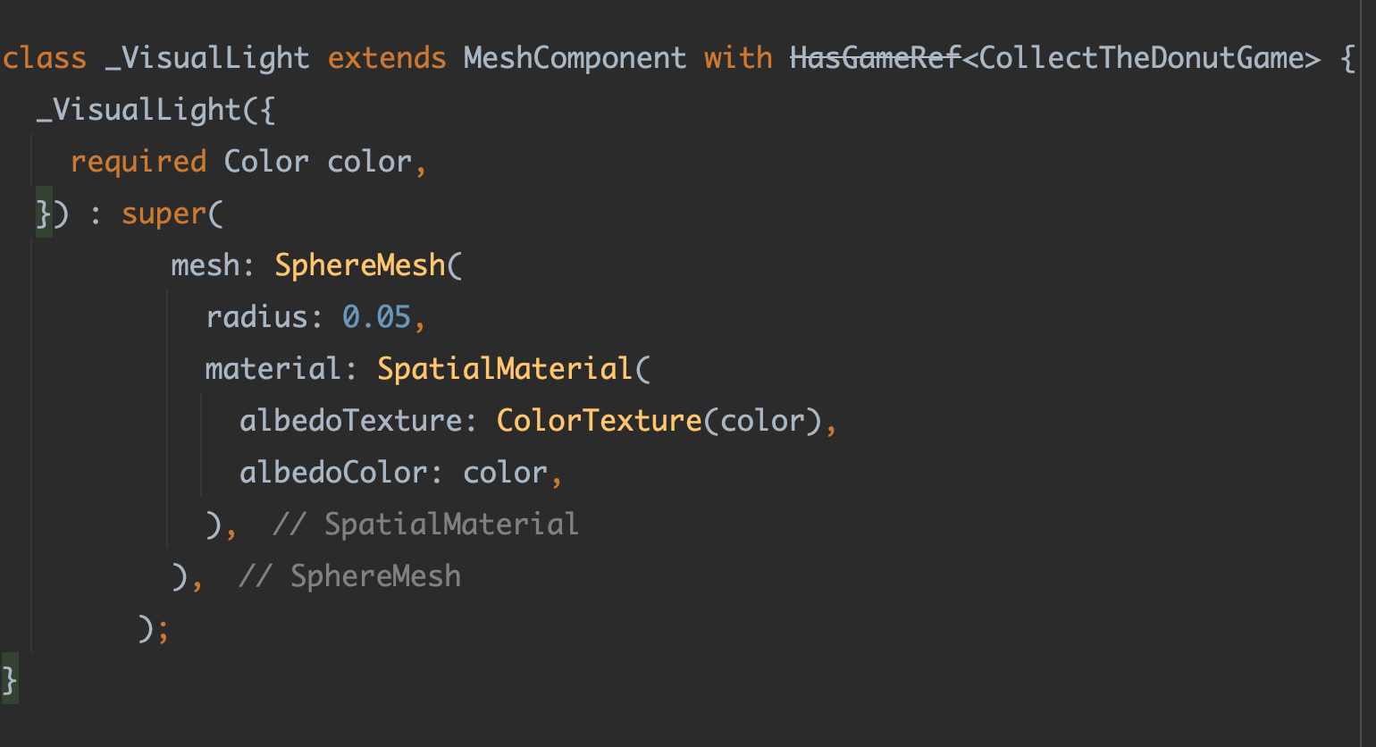 对于光源,同样有一个内部模型对象 _VisualLight ,它同样继承自 MeshComponent,用于渲染光源的视觉效果,这里主要使用了一个小型球体网格 SphereMesh,半径为 0.05,材质为 SpatialMaterial,颜色与光源一致: