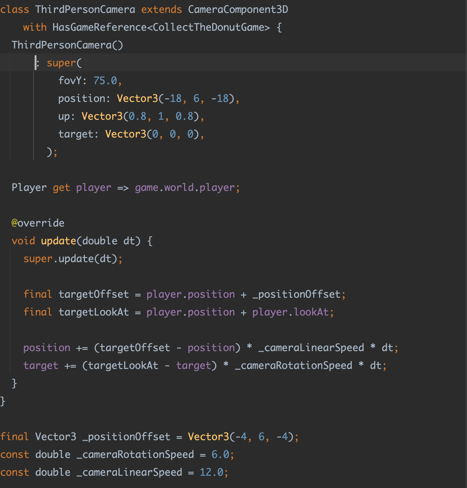 在 ThirdPersonCamera 里它主要是设置了摄像机的视野角度(fovY)、初始位置(position)、上方向向量(up)以及目标点(target),例如position 设置为 Vector3(-18, 6, -18),表示摄像机初始位于玩家后方偏左上方的位置。