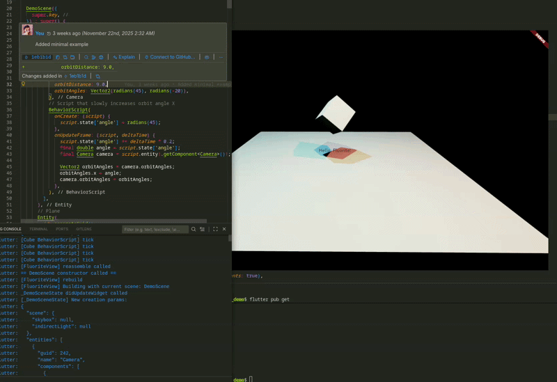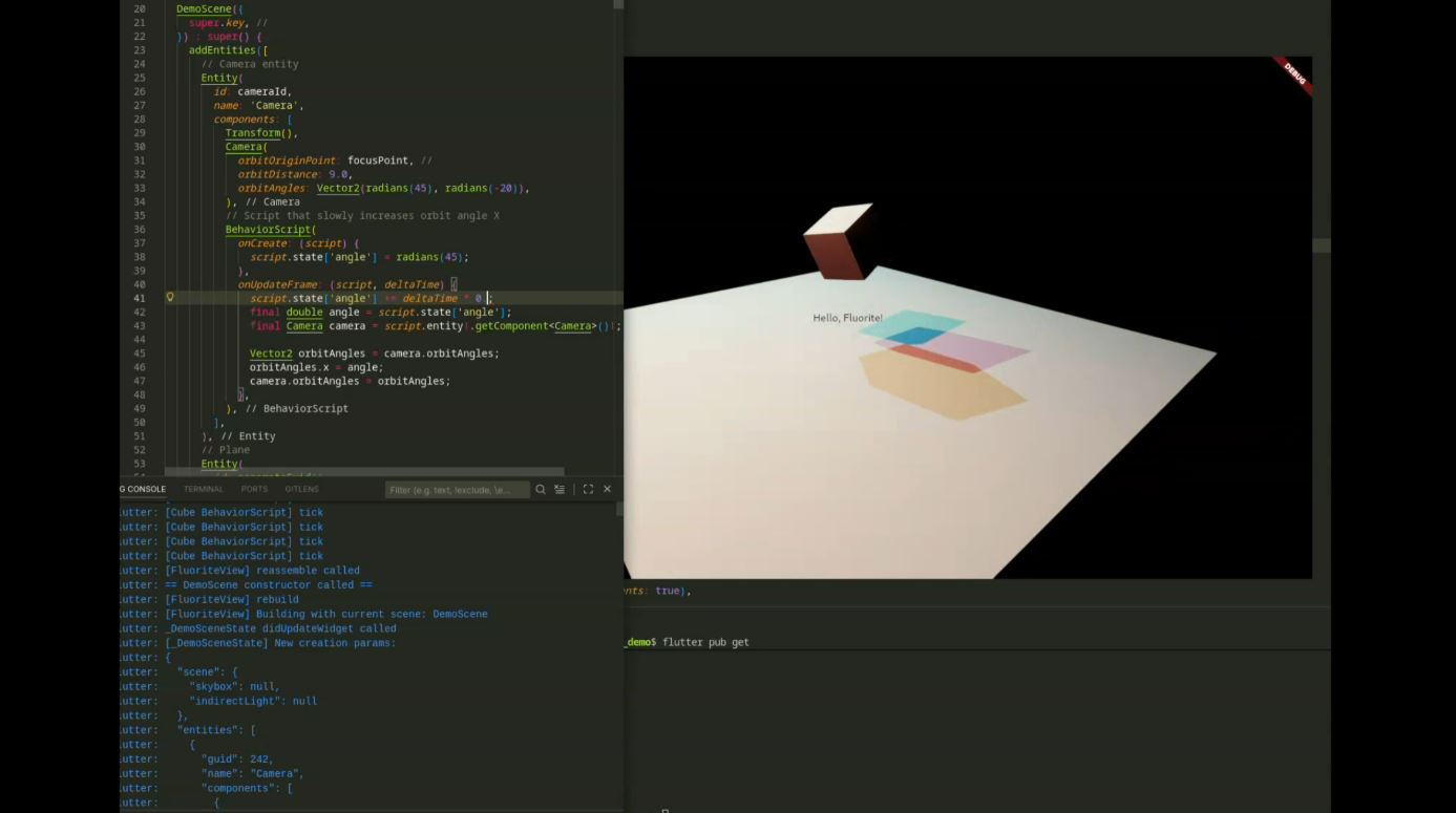 目前 Fluorite 的设计强调高性能、低资源占用,游戏逻辑/UI 用 Dart/Flutter 编写,底层 C++ 优化,核心架构是 ECS(Entity-Component-System),支持热 Hot Reload,包括场景、代码、资产生效: