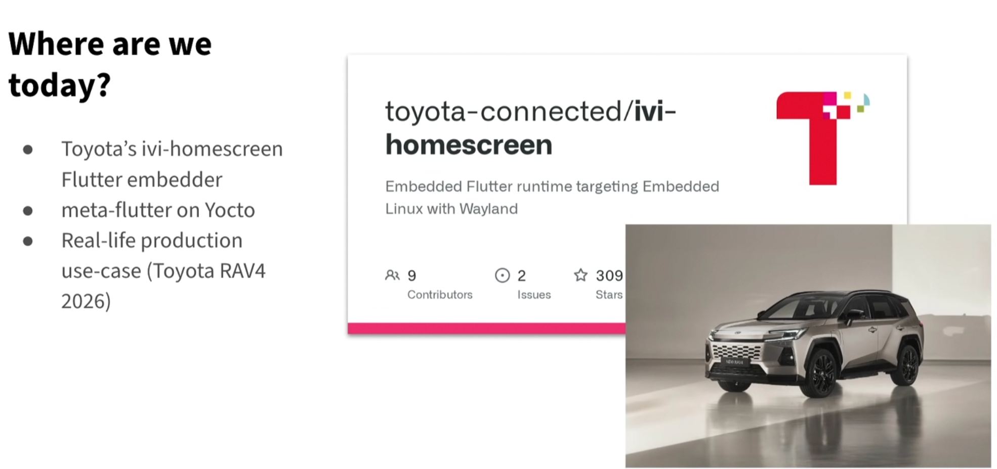 Fluorite 是首款完全集成 Flutter 的主机级(console-grade)游戏引擎,主要针对车载数字座舱(digital cockpit)和嵌入式低端硬件设计,已在 2026 款丰田 RAV4 的信息娱乐系统上运行,并在 2026 年 2 月在 FOSDEM 2026 大会上公布 :
