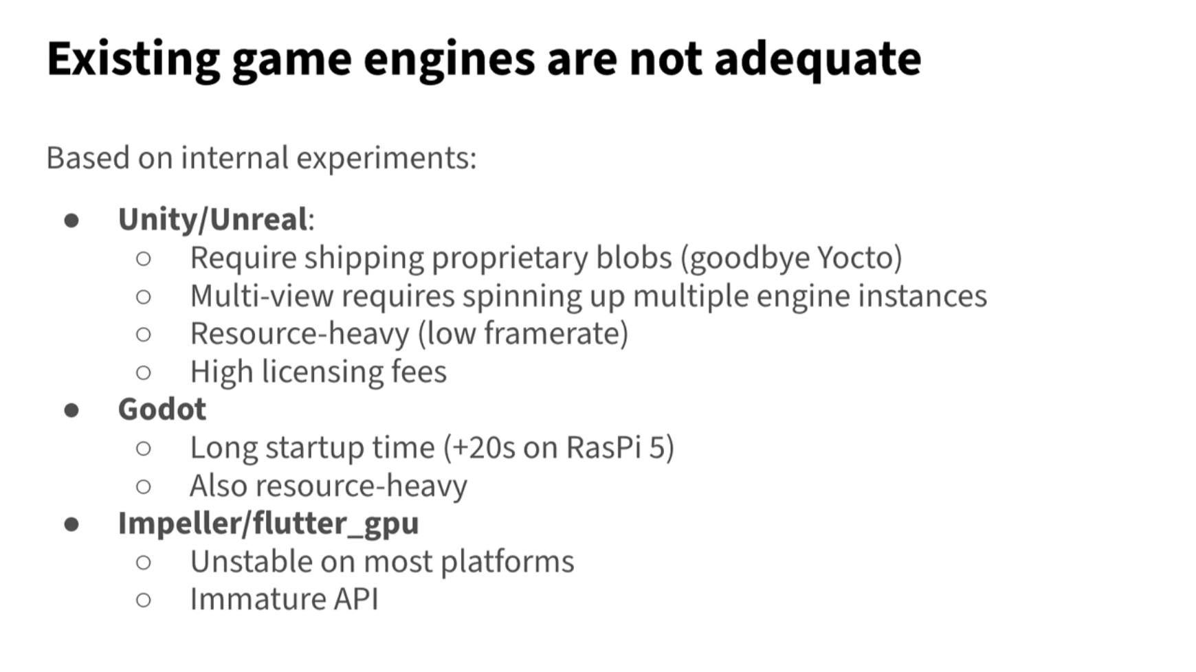 TCNA 明确表示 Fluorite 将会作为开源项目独立发布,在 OpenEmbedded/Yocto 中目前已经有 Fluorite 示例场景的配方(recipes),而之所以选择采用 Flutter 自研 Fluorite,是因为丰田需要避免使用 Unity/Unreal 等专有引擎带来的费用高、资源重和许可问题,而不直接使用 flutter_gpu,则是目前整体成熟度还不够: