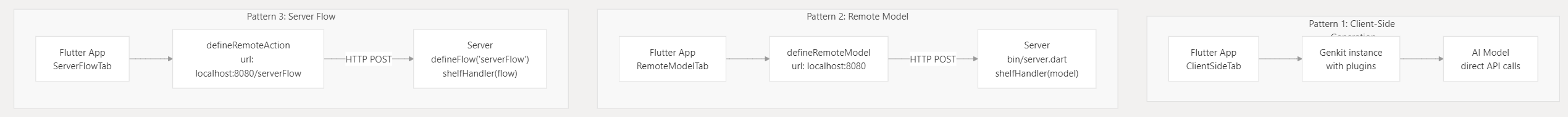 更有趣的是,你可以在 Flutter App 中直接使用 Genkit 执行 AI 逻辑,直接使用本地模型,也可以把 Flutter App 作为 Client 调用远端的 Genkit 服务,远程的 Genkit 服务可以用 Python,TS ,GO 甚至 Dart 来写: