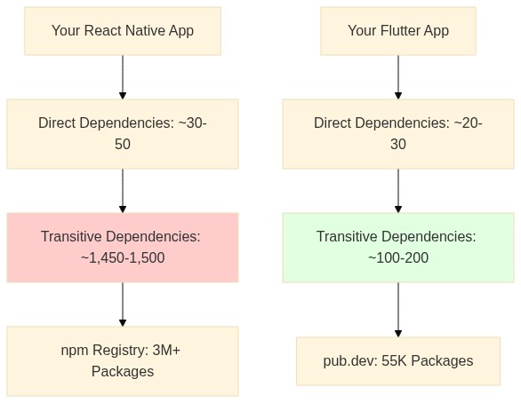 而 Flutter 的 pub.dev 生态系统嵌套规模相对没那么深,整体审计难度相对较低,另外 Flutter 用 AOT 编译将 Dart 编译成原生 ARM 机器码,生成的二进制文件逆向成本对比 JS 工程偏高,这算是 Flutter 的相对优势。