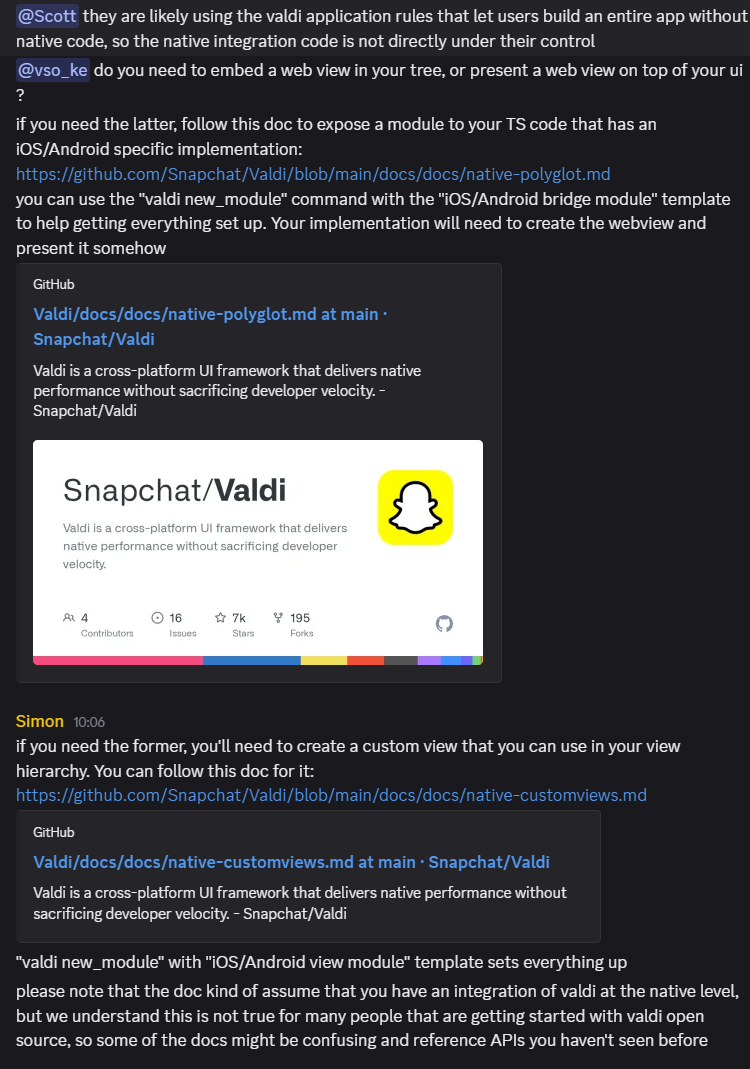 举个例子,比如关于 Webview 支持,虽然 Valdi 内部已经实现了这个功能,但它没有包含在开源项目,用户需要通过定义一个带有 ExportProxy 的接口,然后在原生实现这个方法 :