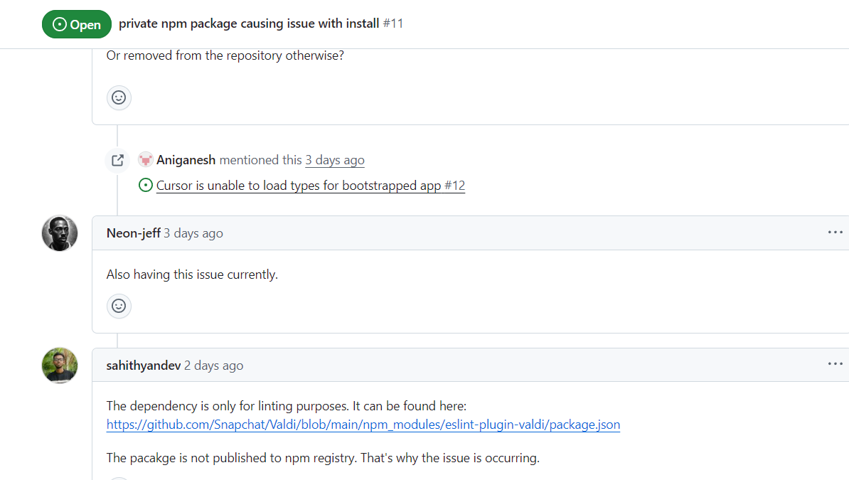 package.json列出了@snapchat/eslint-plugin-vivaldi还是一个私有 NPM 依赖,类似的还有 Bazel 构建脚本失败,问题也是构建脚本正试图使用 SSH 从一个私有 GitHub 仓库(名为@valdi)抓取依赖,可以看出来本次开源还是相对仓促: