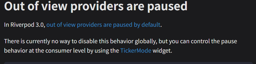 为了优化资源使用,Riverpod 3.0 引入了暂停/恢复机制。当一个 Widget(及其关联的 Provider 监听器)不在屏幕上时,监听器会自动暂停,这个行为是默认启用的,并且看起来不支持全局关闭,你可以通过 Flutter 的 TickerMode 来手动控制监听器的暂停行为:
