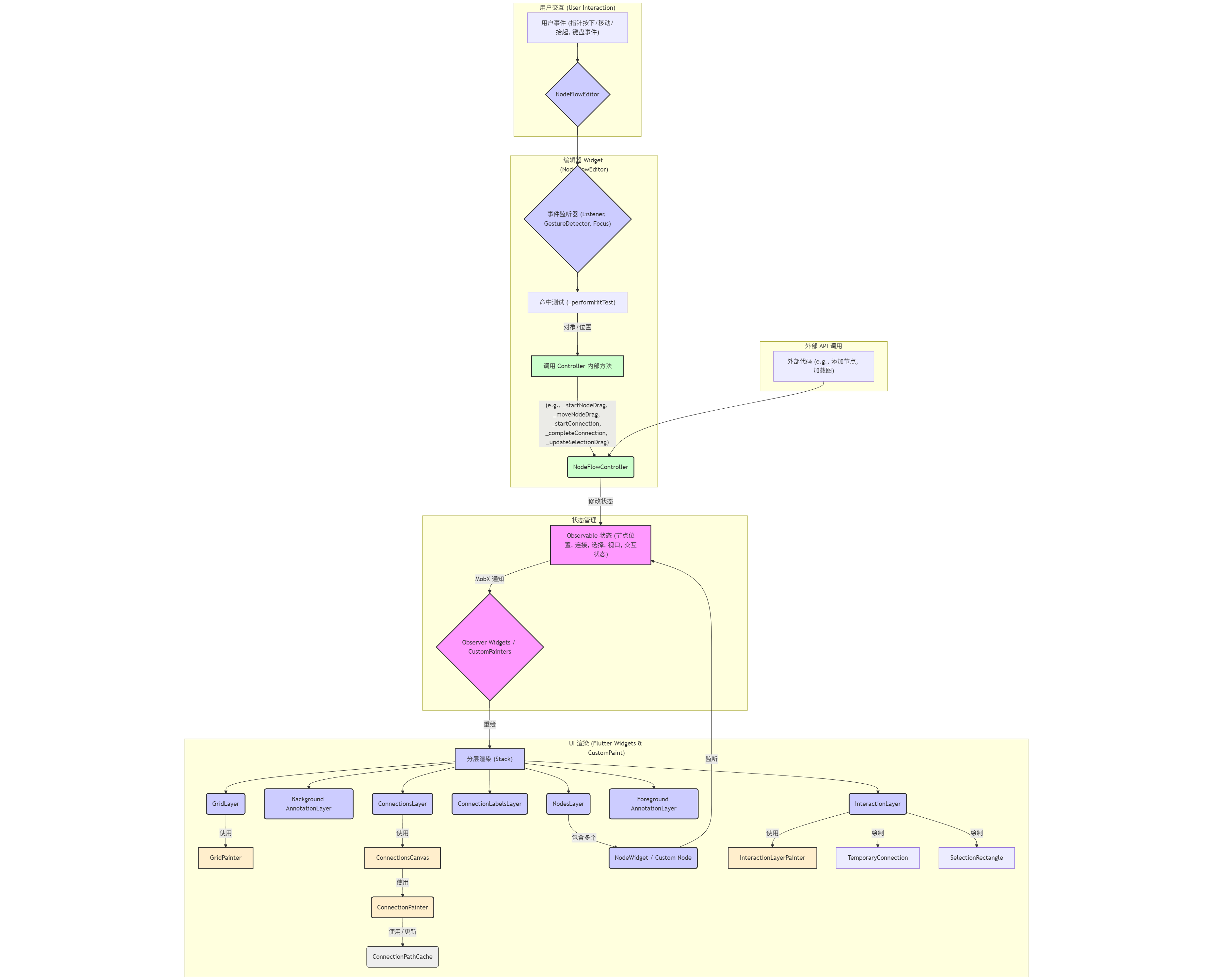 _performHitTest) 以确定交互对象(画布、节点、端口、连接、注解),然后调用NodeFlowController中对应的内部方法 (_startNodeDrag,_moveNodeDrag,_startConnection,_completeConnection,_updateSelectionDrag等)来更新 MobX 状态 - 这些状态更新会自动触发相关